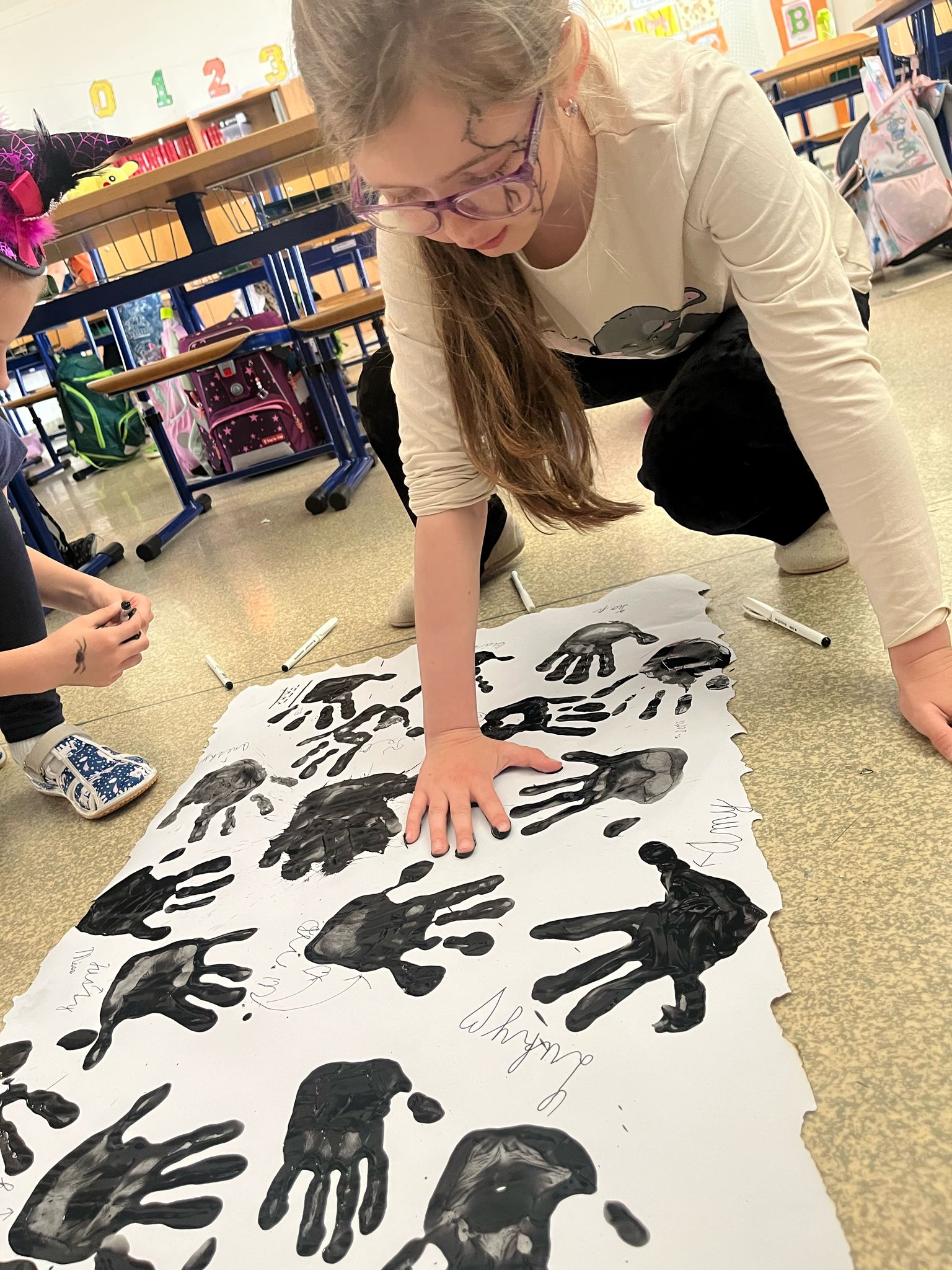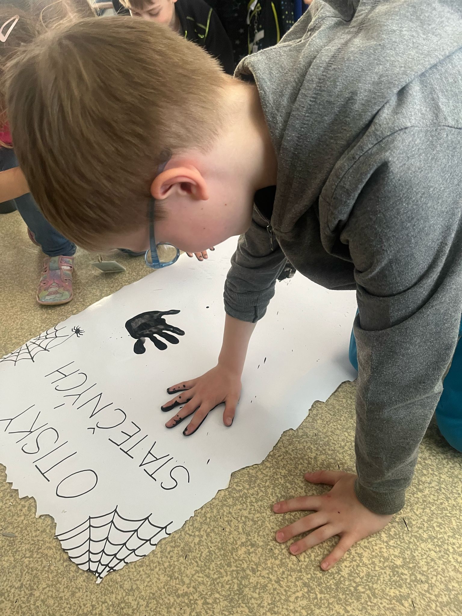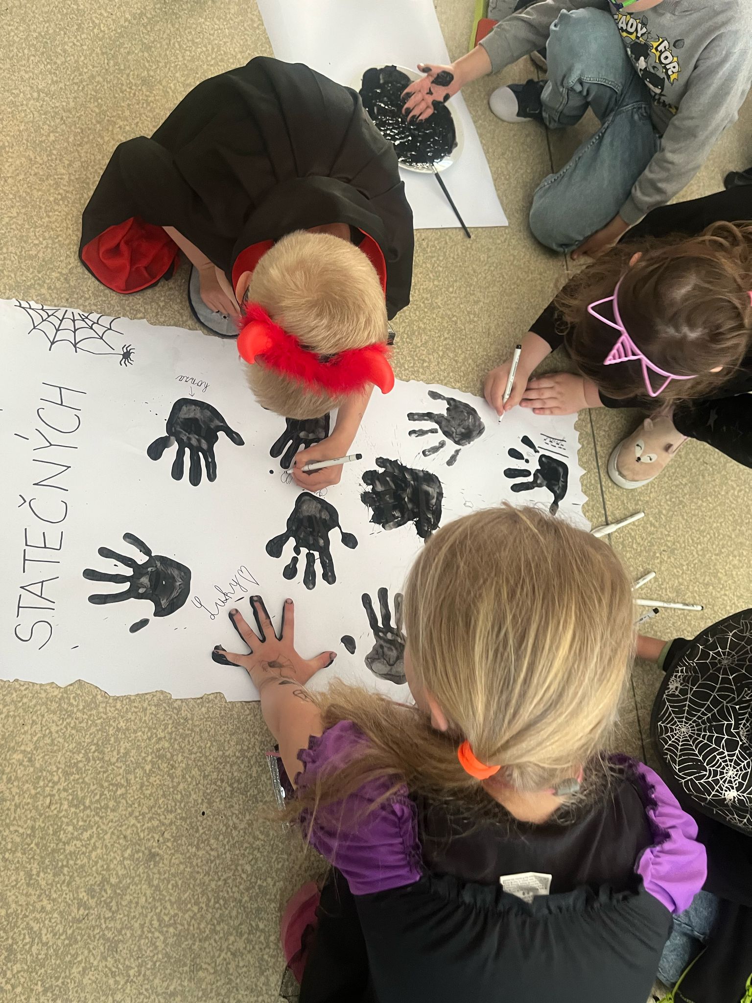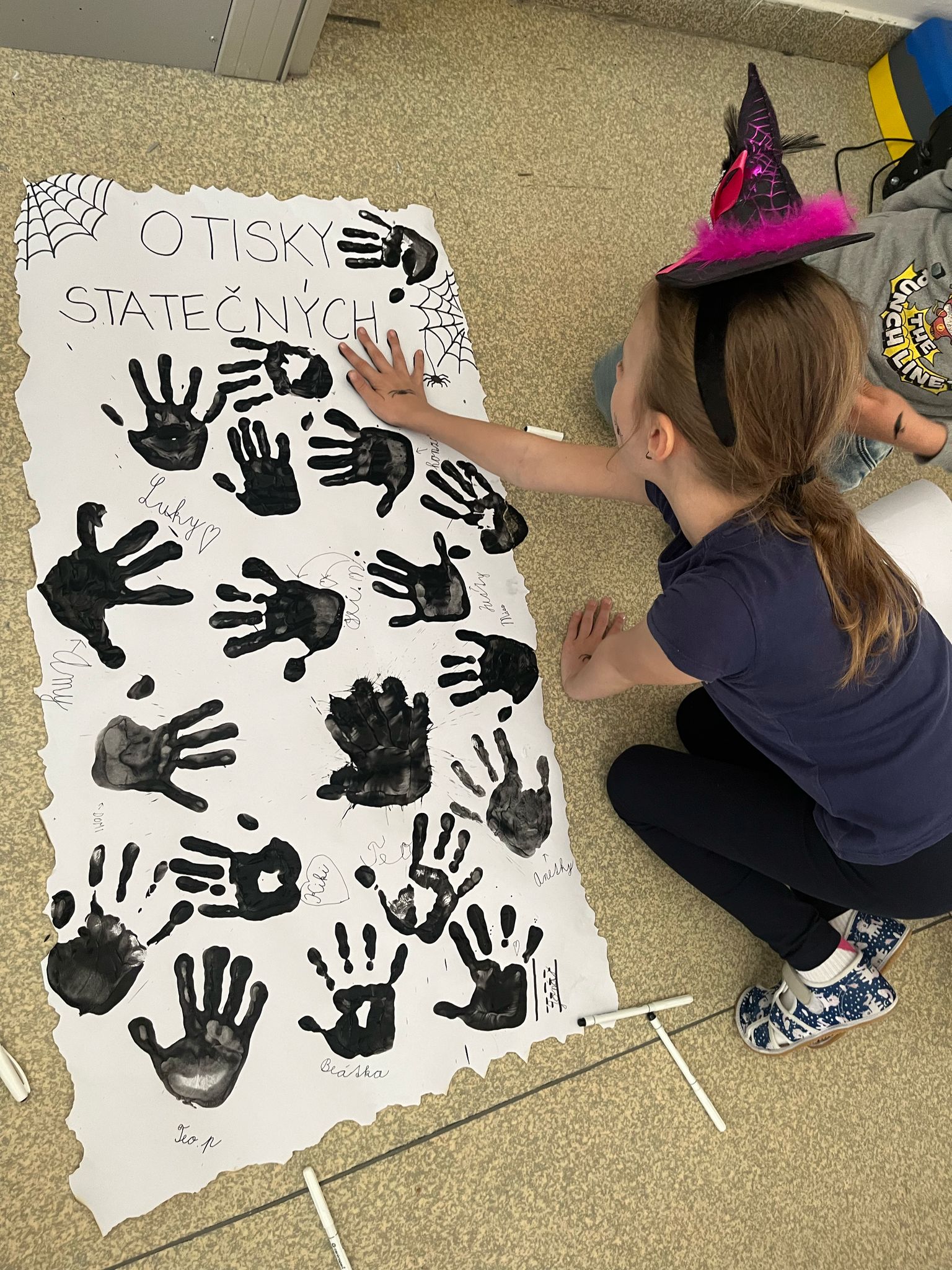 V hodině pracovní výchovy jsme se pustili do opravdu magických aktivit. Nejprve jsme zkoumali tajemné předměty, které Baba Jaga ukryla ve svém kotlíku. Každý z nás musel sáhnout dovnitř a podle hmatu uhodnout, o co se jedná – od pavouků až po slizké hady! Poté jsme společnými silami připravili bublající lektvar, který měnil barvy – samozřejmě bezpečně pod dozorem Baby Jagy. Nakonec jsme vytvořili „Listinu statečných“, na kterou každý z nás otiskl svou dlaň jako důkaz odvahy a kouzelnických schopností.