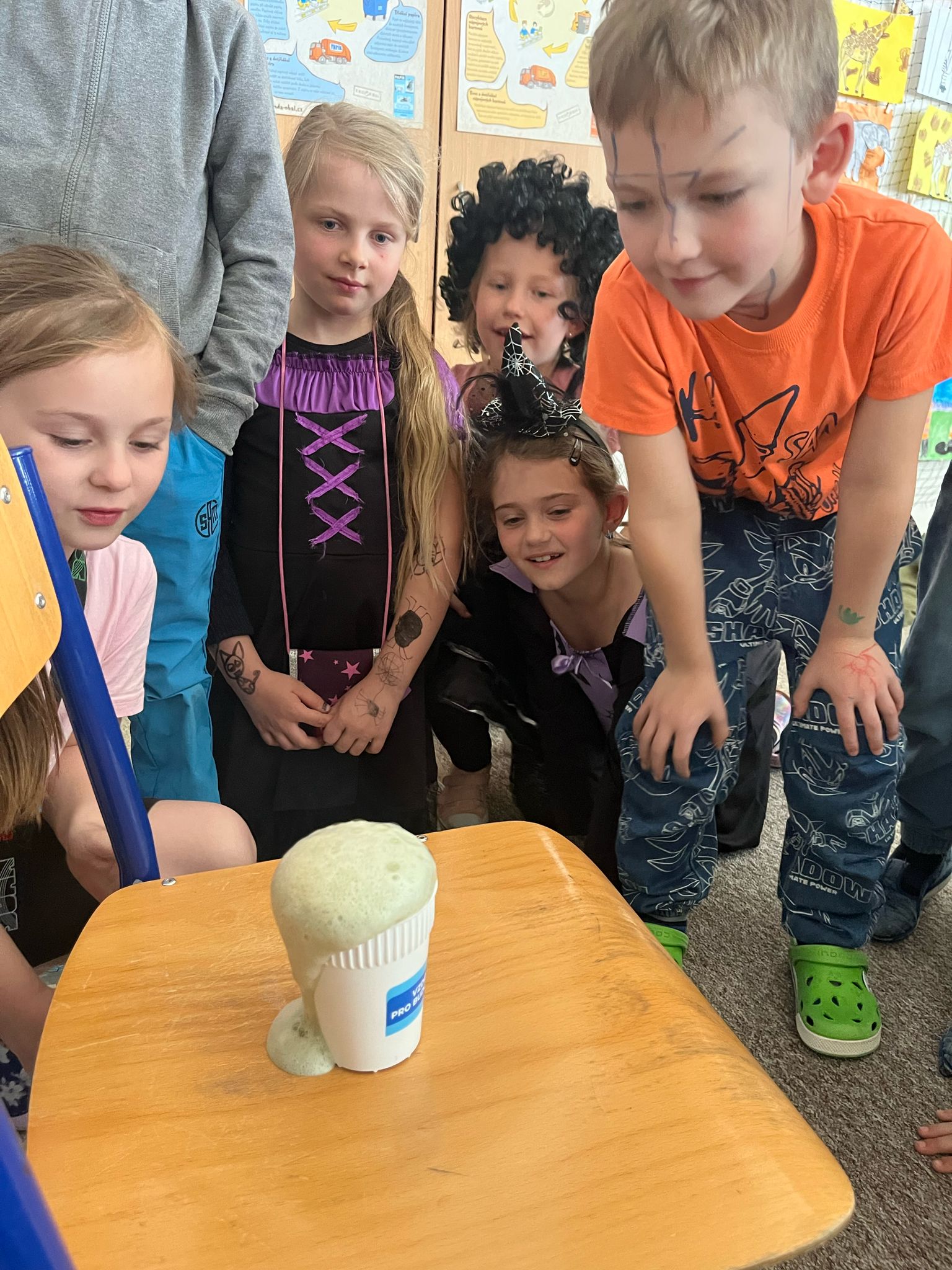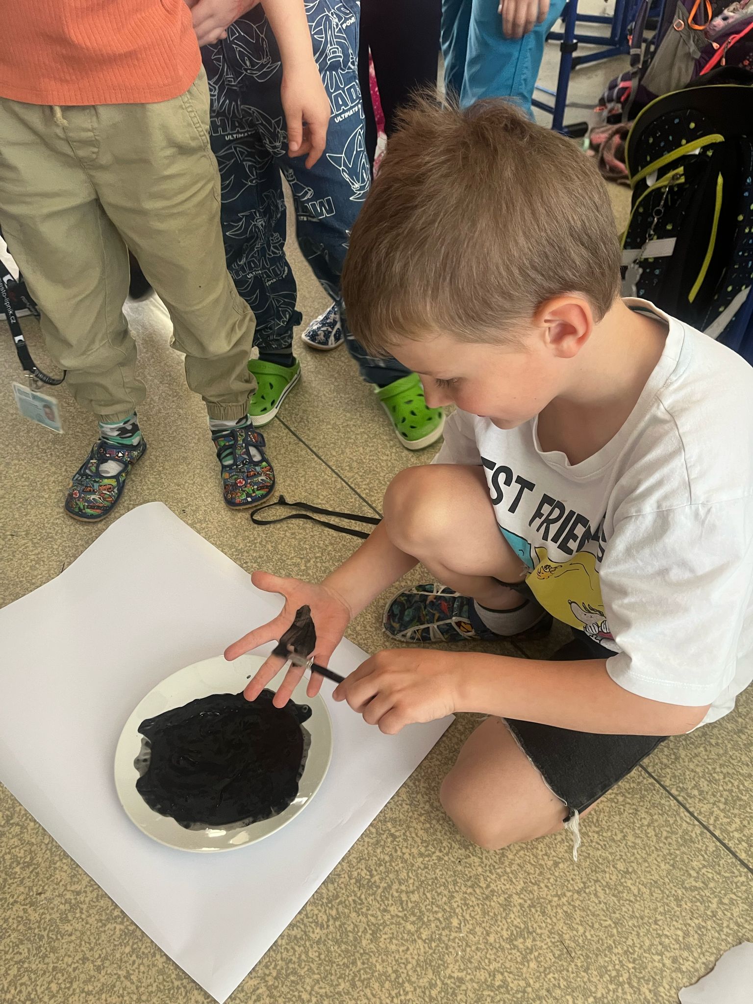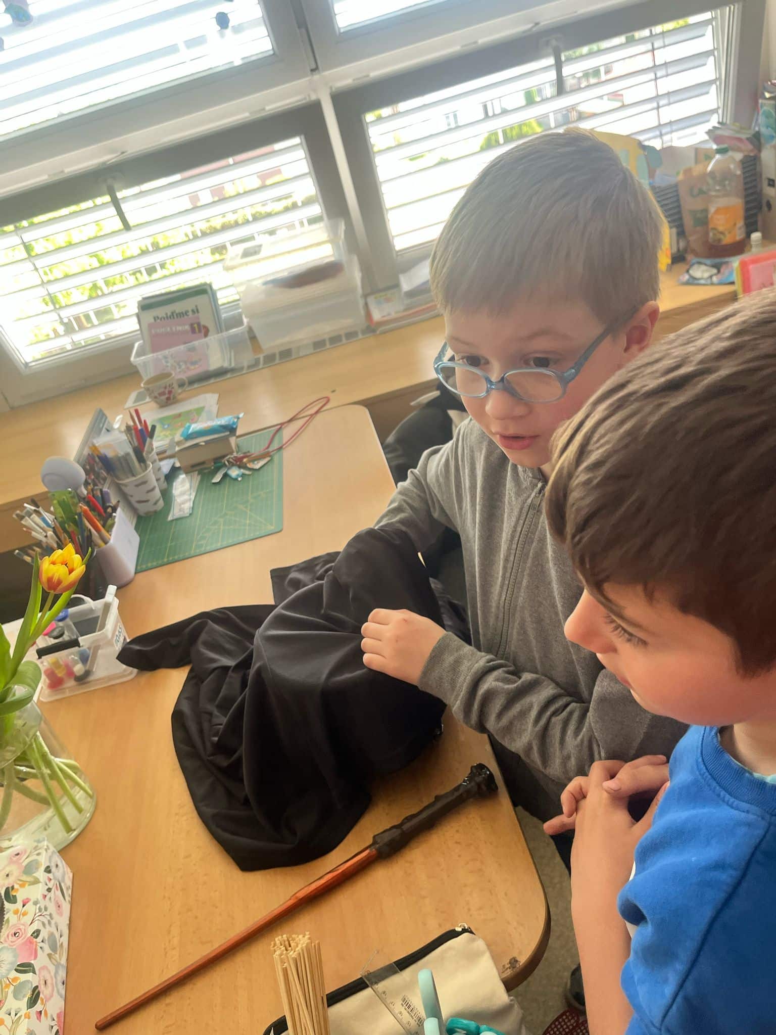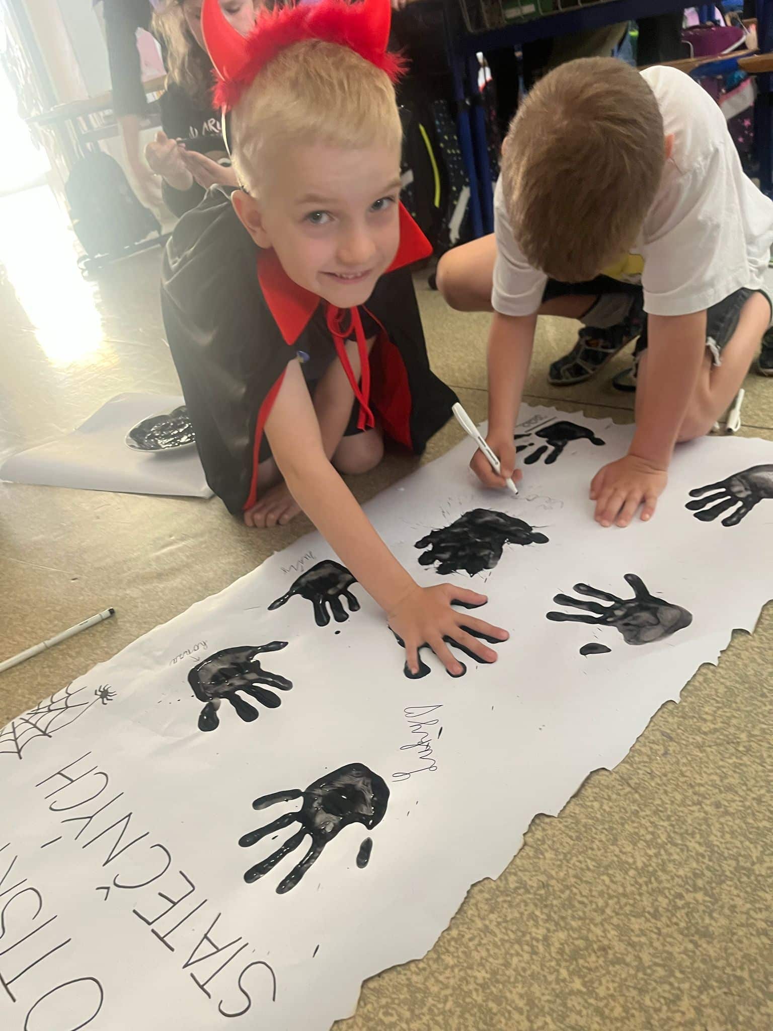 V hodině pracovní výchovy jsme se pustili do opravdu magických aktivit. Nejprve jsme zkoumali tajemné předměty, které Baba Jaga ukryla ve svém kotlíku. Každý z nás musel sáhnout dovnitř a podle hmatu uhodnout, o co se jedná – od pavouků až po slizké hady! Poté jsme společnými silami připravili bublající lektvar, který měnil barvy – samozřejmě bezpečně pod dozorem Baby Jagy. Nakonec jsme vytvořili „Listinu statečných“, na kterou každý z nás otiskl svou dlaň jako důkaz odvahy a kouzelnických schopností.