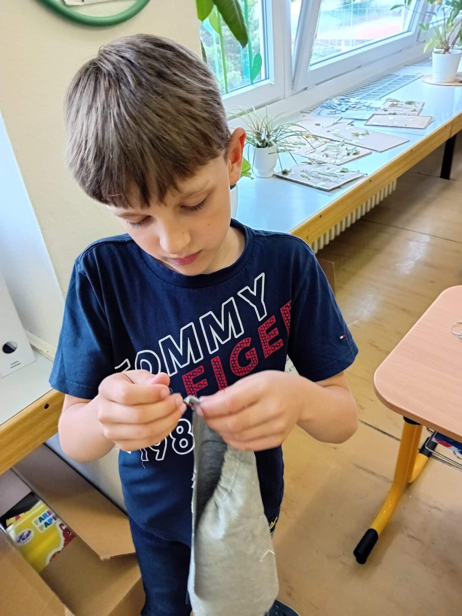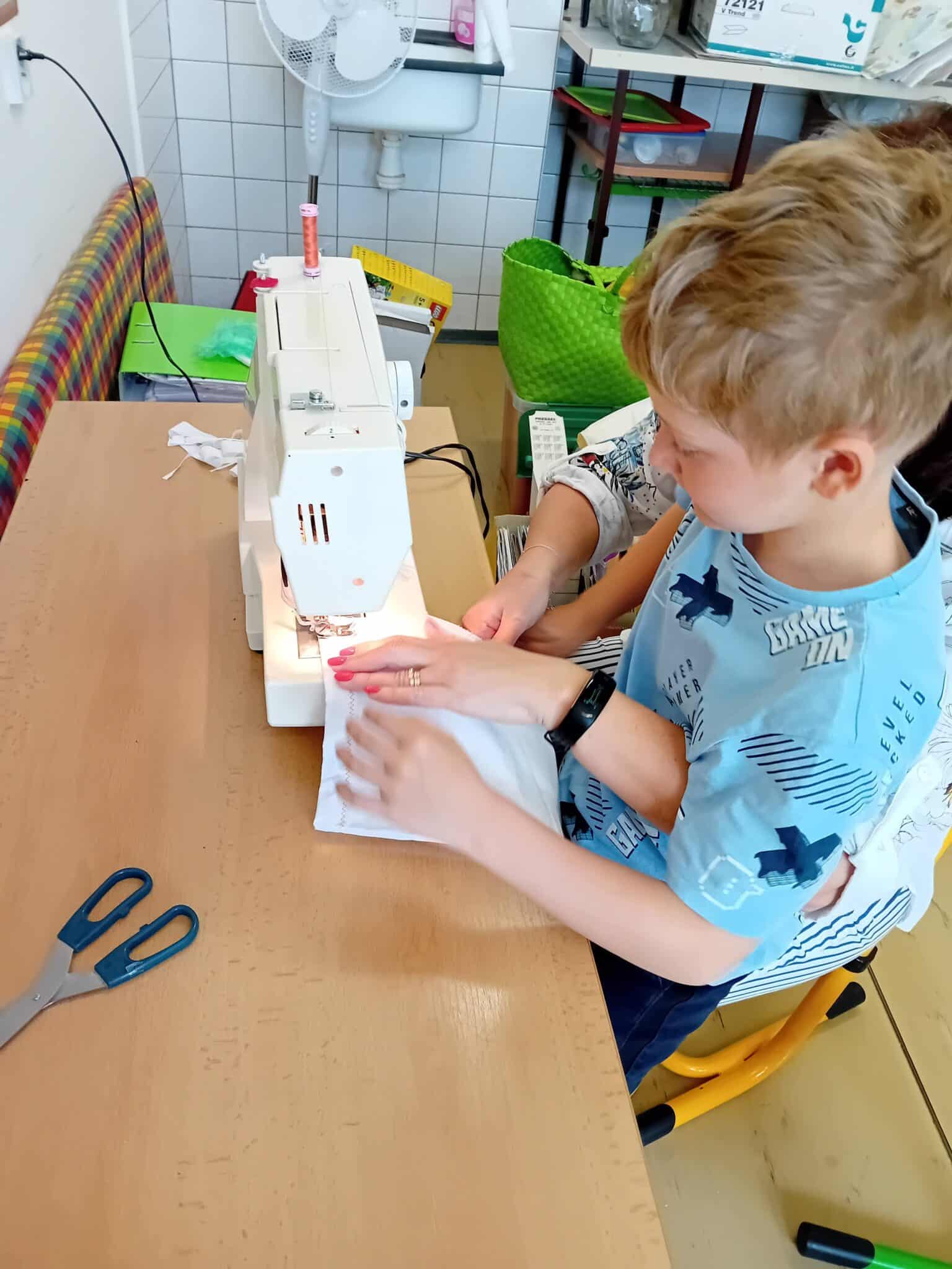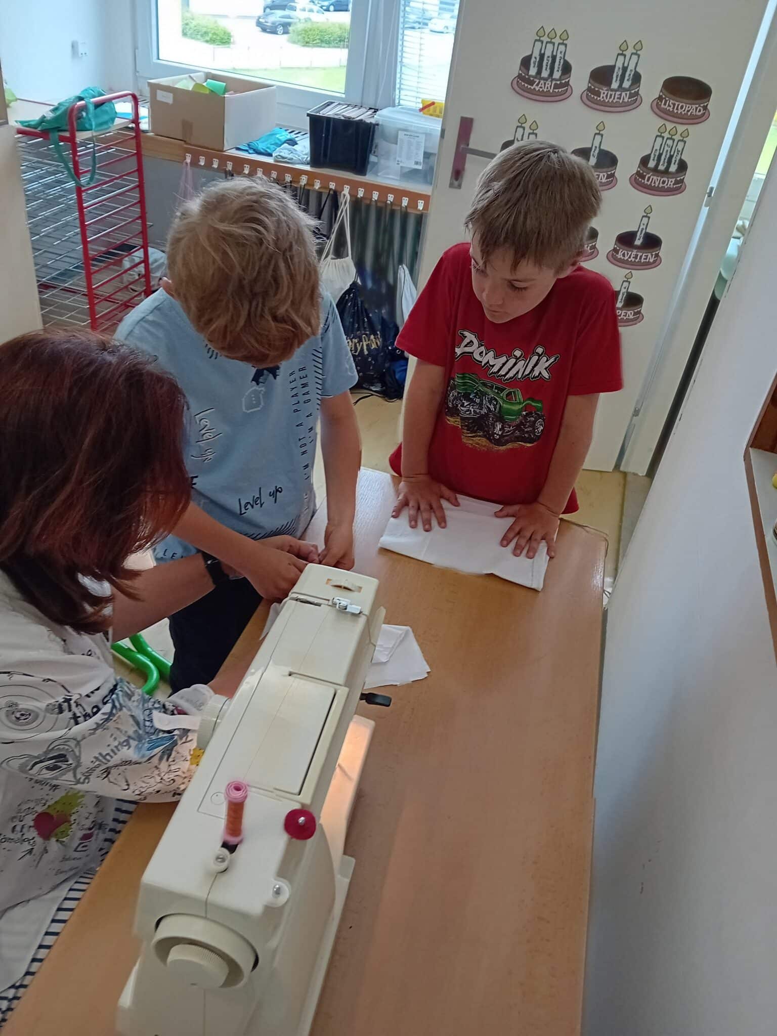 Vše odstartovalo dumání dětí nad tím, jak se šije pomocí stroje. Protože víme, že děti se lépe učí praxí a vnímáním světa okolo více smysly, tak byly seznámeny s opravdovým šicím strojem. Po prvotní zkoušce šití jsme dětem připravili látku na pytlíky, které děti využijí o prázdninách. Děti se nejdříve naučily navléct šňůrku do tunýlku a poté s dopomocí sešily strany látky tak, aby vznikl pytlík. Na závěr si je děti vyzdobily kresbami s motivy prázdnin.