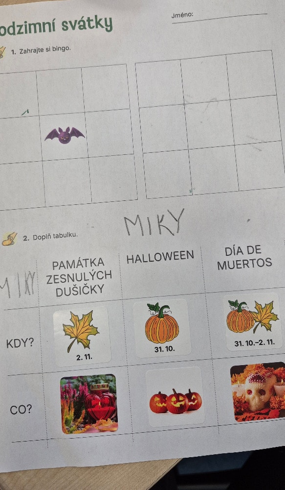 Provedli jsme pokus s tančícími duchy ve sklenici, porovnali jsme všechny podzimní svátky (Dušičky, Halloween, Día de los muertos) na fotkách i v tabulce.