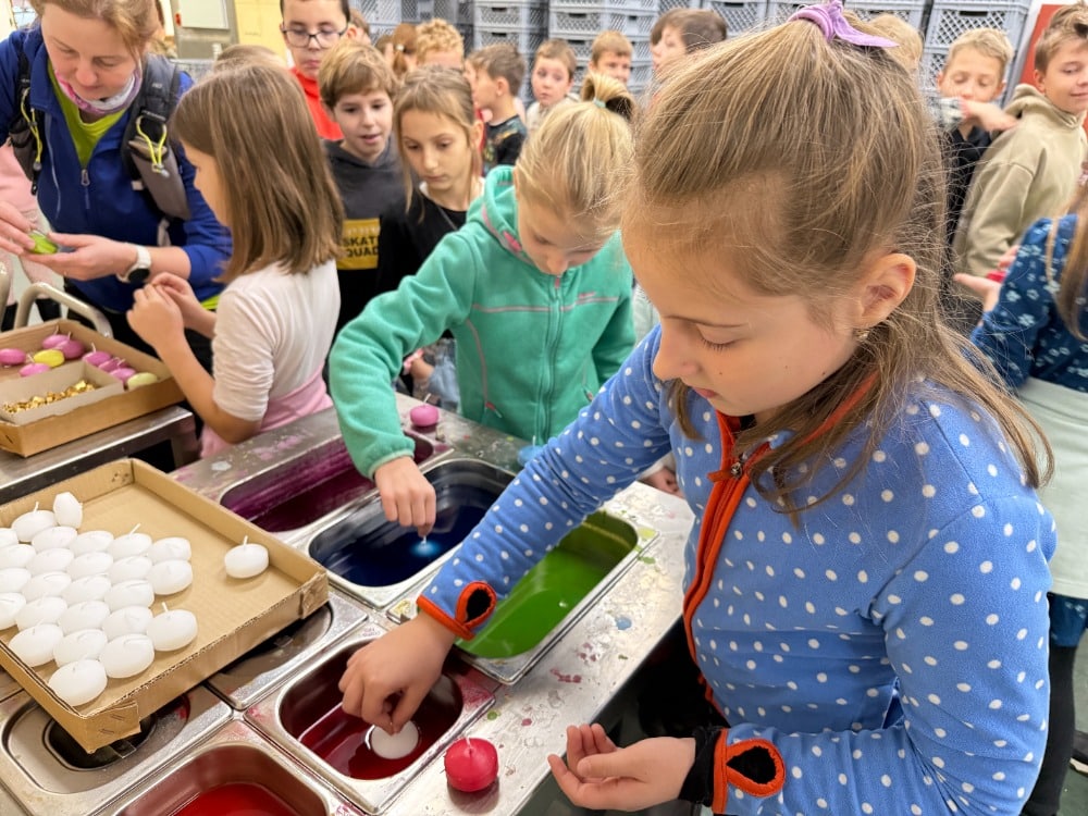 Jedno krásné ráno jsme vyměnili školní lavice za autobusová sedadla a vyrazili do světa svíček a vánočních ozdob. První zastávkou byla rodinná firma Unipar v Rožnově pod Radhoštěm, kde děti zjistily, že svíčka není jen „něco, co hoří“, ale taky pěkná věda. Podívali jsme se na samotnou výrobu svíček, která probíhá lisováním za studena, sledovali inovativní technologie a nakonec vystoupali po schodišti do galerie, kde jsme si mohli prohlédnout konečné podoby svíček, které byly, mimo jiné, vyráběny také do zahraničí. Součástí exkurze byla možnost vyzkoušet si obarvení svíčky, a tak vznikla pestrá sbírka originálních výtvorů.