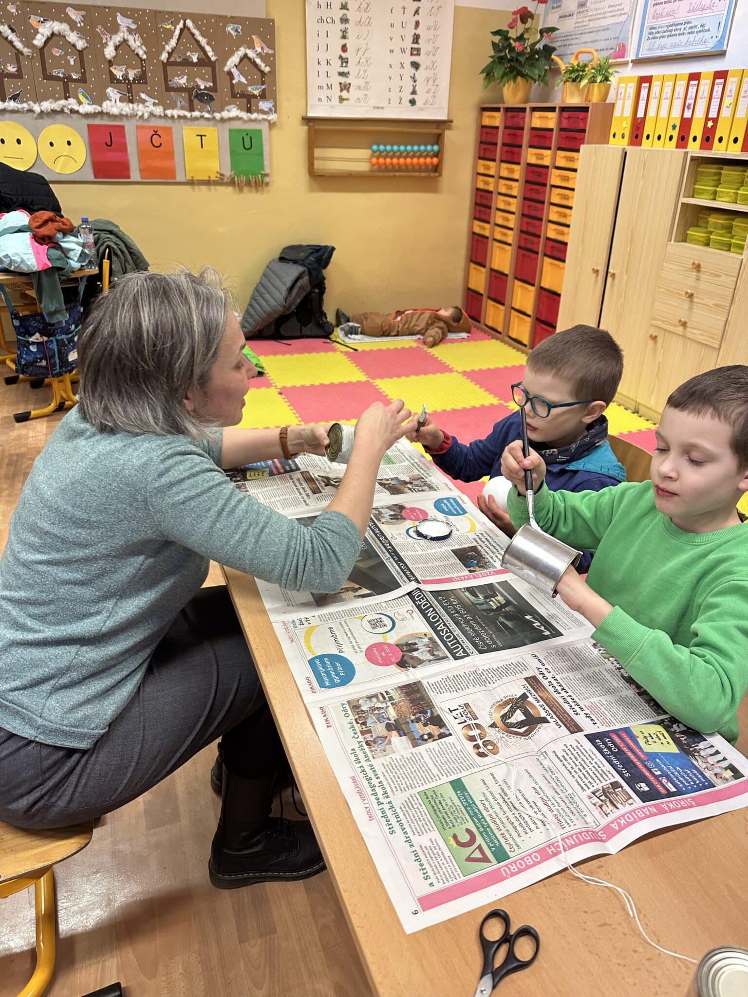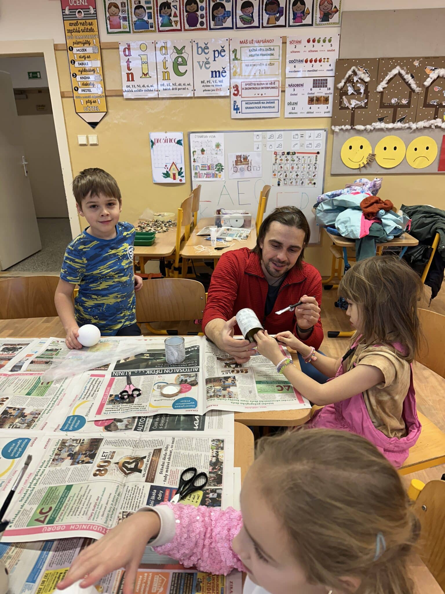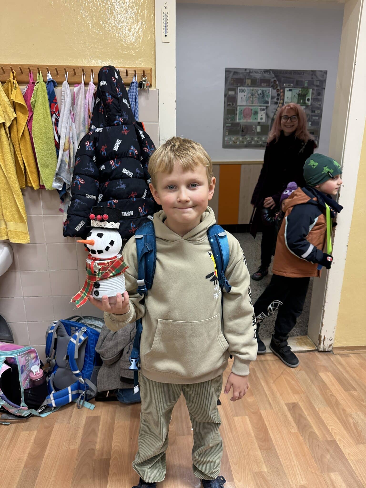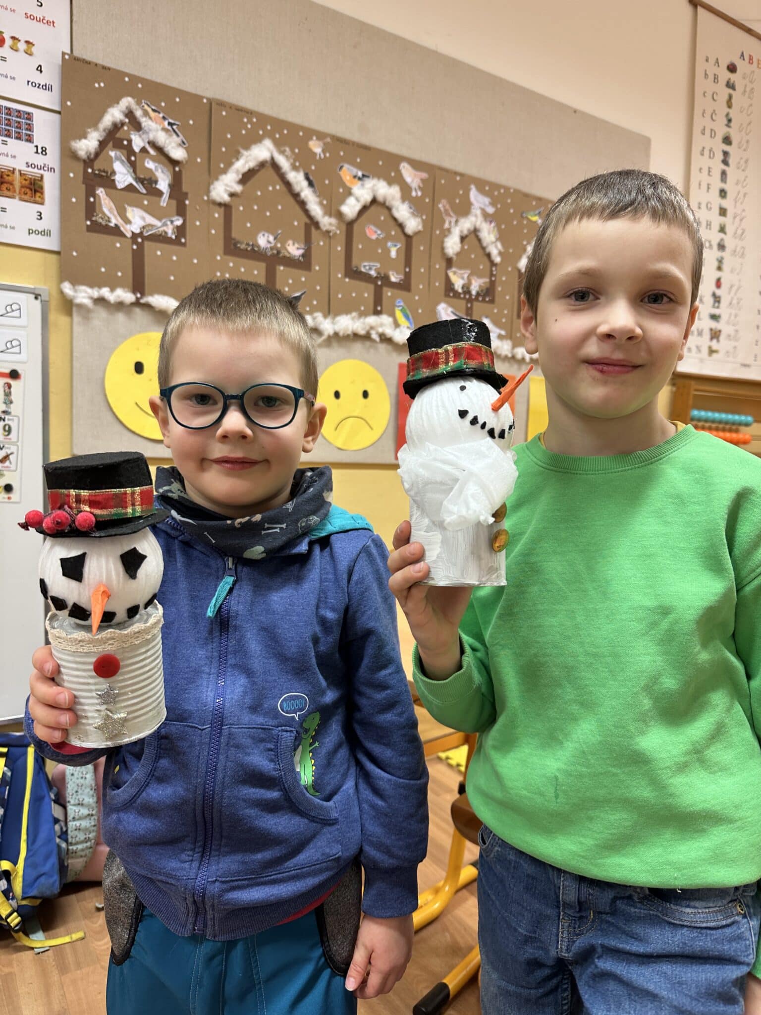 Pod vedením paní Šárky Žárské a za aktivní pomoci rodičů si děti vyrobily vánočního sněhuláka z plechovky a polystyrenové koule. Každý sněhulák byl originál a odrážel dětskou fantazii i pečlivou práci malých tvůrců. Vznikaly tak krásné dekorace, které si děti donesly domů, aby jim vánočně vyzdobily domácnost. Tvoření bavilo malé i velké, jen jeden malý bráška celé adventní odpoledne spokojeně prospal a vánoční atmosféru si tak užil po svém.