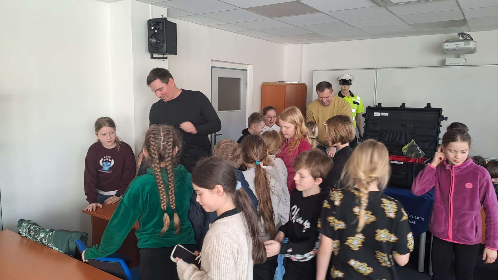 Tisková mluvčí paní Janovská pro ně pohotově připravila náhradní program. Nejprve žáci odpovídali na otázky týkající se kyberšikany a nebezpečí na sociálních sítích, na které jim přímo odpovídali policejní experti – technici. Děti tak měly jedinečnou příležitost dozvědět se mnoho zajímavých a užitečných informací z praxe.