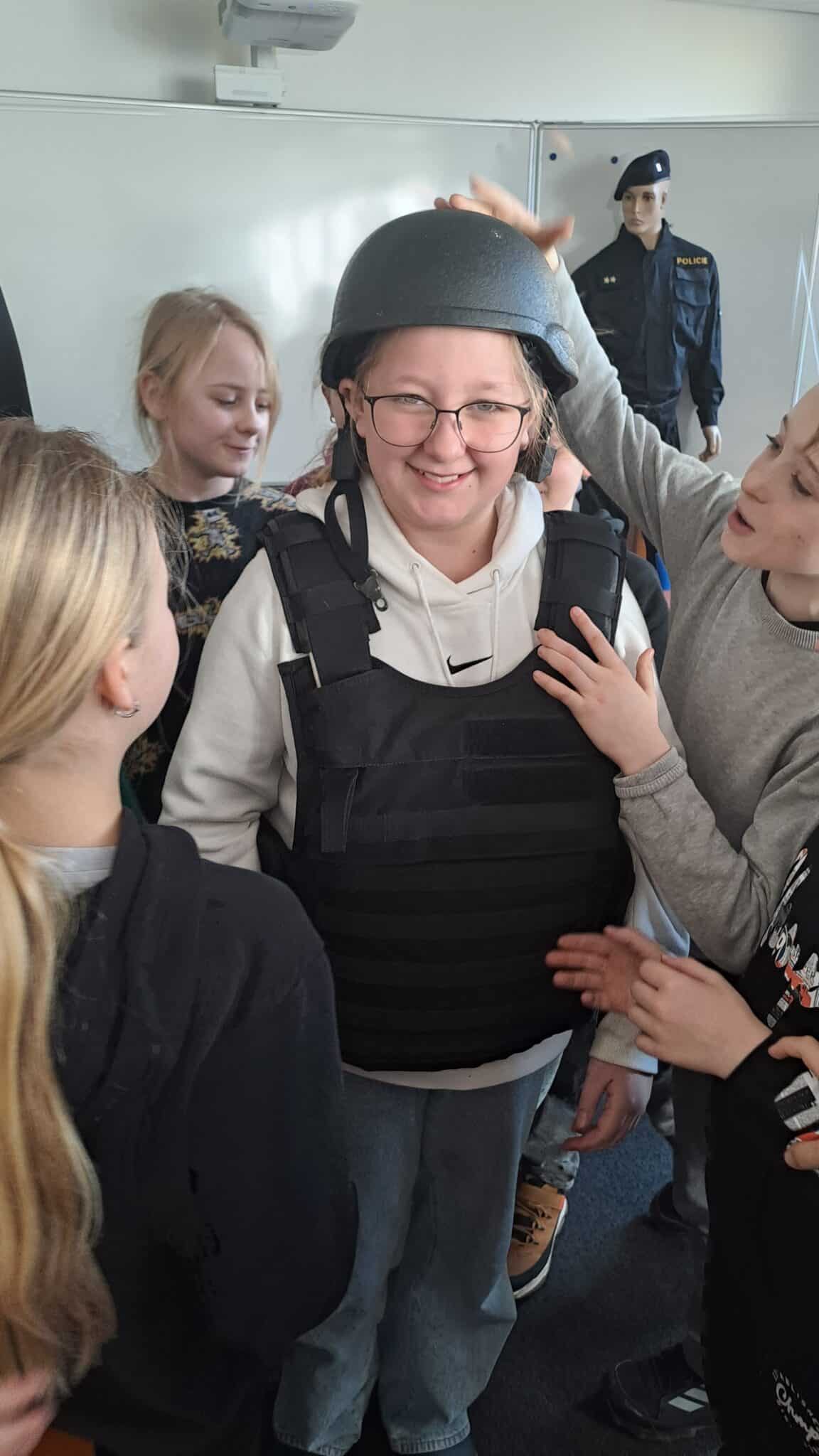 Následně si mohly prohlédnout technické vybavení, se kterým policisté při své práci pracují. Velkým zážitkem bylo také to, že si děti mohly vyzkoušet policejní helmu a neprůstřelnou vestu. Na závěr jim policisté představili vybavení policejního automobilu.