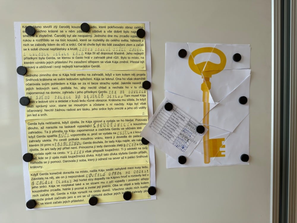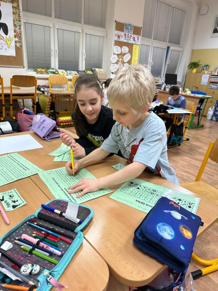 Třída 2. B se během večera ponořila do pohádky Sněhová královna. Než se děti dostaly k samotnému čtení, musely nejprve zapojit hlavy i důvtip — pomocí morseovky, obrázkové šifry, obrázků a abecední šifry postupně doplňovaly text pohádky. Když pak příběh společně přečetly, povídaly si také o hlavní hrdince Gerdě a o jejích krásných vlastnostech, jako jsou odvaha, věrnost a vytrvalost.