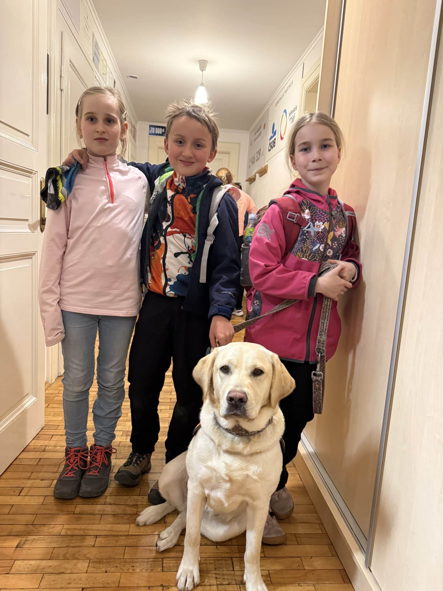 Hned po příjezdu nás čekalo milé setkání s naší psí kamarádkou Bazalkou, kterou známe už od štěněte. Je to dvouletá fenka labradorského retrievera. Bazalka je speciálně cvičená jako vodicí pes pro nevidomé a brzy začne plnit své důležité poslání. Bylo pro nás velmi inspirující vidět, jak se z hravého štěněte stává spolehlivý pomocník pro lidi se zrakovým handicapem.