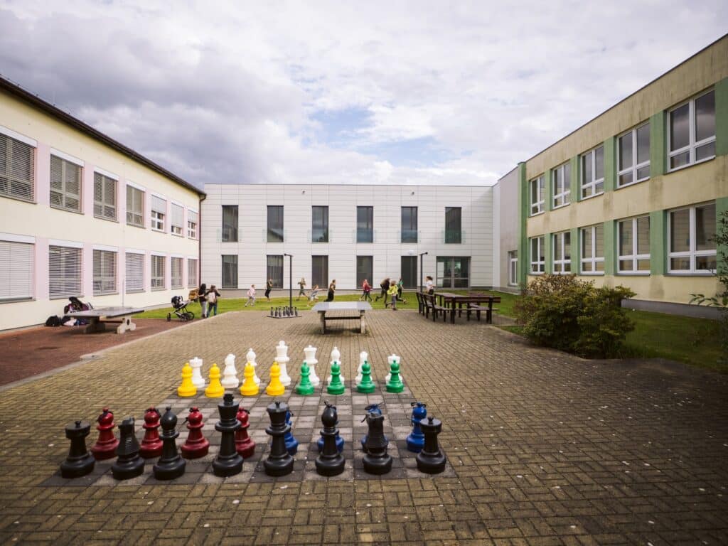 Budovy školy tvoří celkem sedm pavilonů, prostory mezi nimi tvoří travnaté plochy. Celý komplex budov utváří krásný dvůr se zelení a vzrostlými stromy, kde se nachází i venkovní učebna.